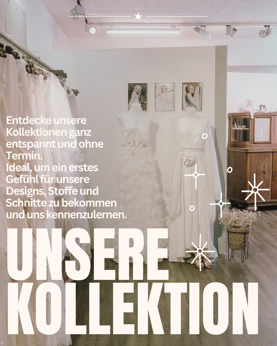 PS: Leider können am Open Studio Sunday keine Brautkleider anprobiert werden. Du kannst aber gern gleich deinen Termin vereinbaren und dann nehmen wir uns 2 Stunden für dich Zeit, Dein Traumkleid mit dir zu finden ♥