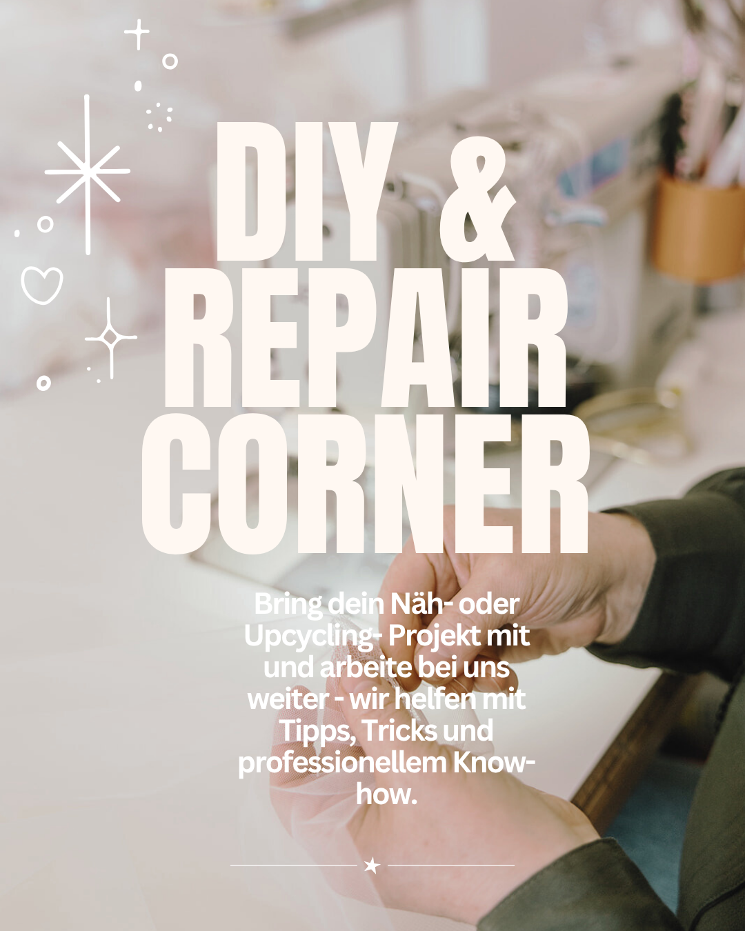 In unserer kleinen DIY- & Repair-Ecke kannst du weiterarbeiten, Fragen stellen oder dich einfach austauschen. Wir geben Tipps, Tricks und ein bisschen Couture-Know-how.